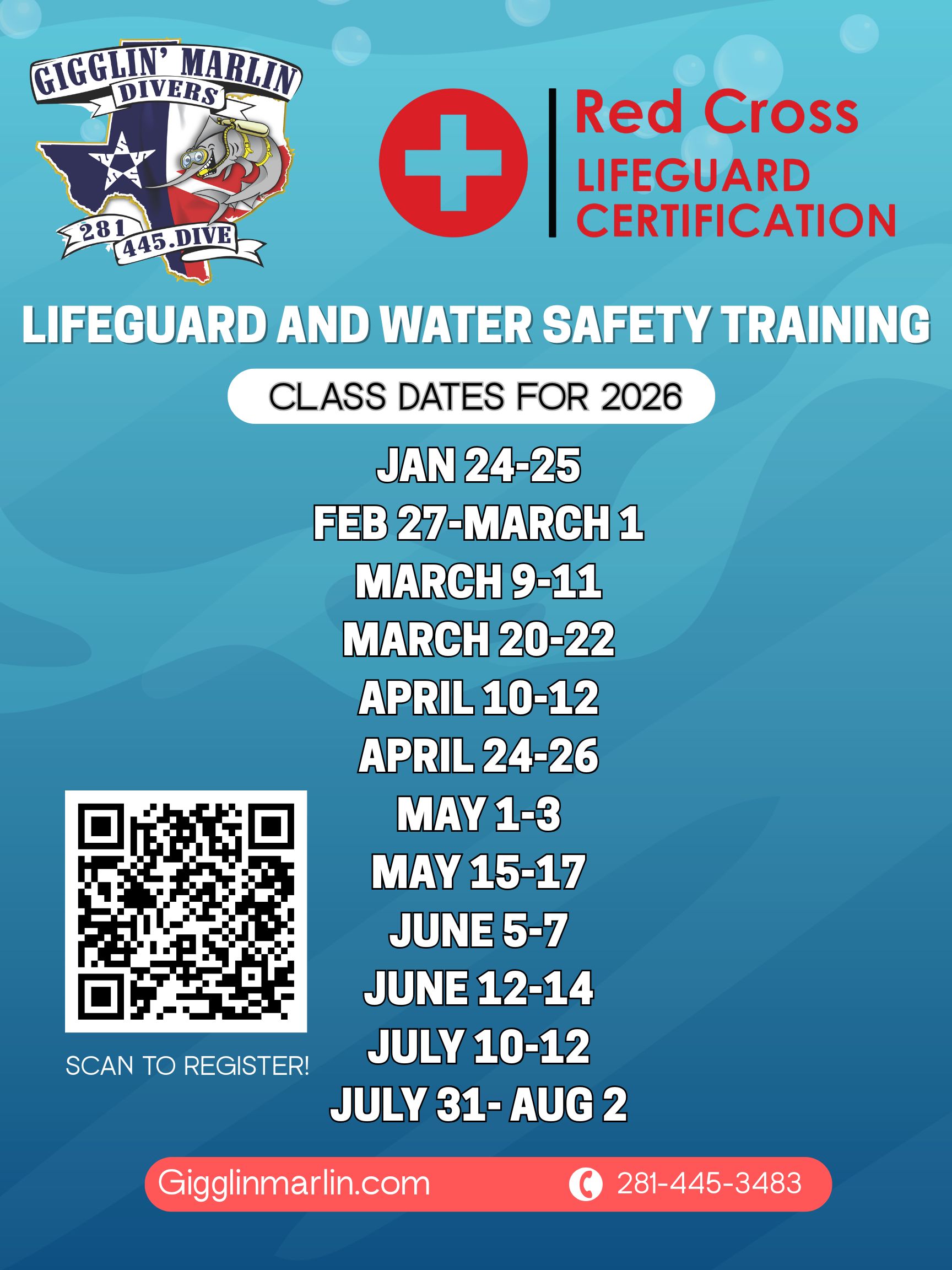 Due to the nature of the blended learning format of the course, registration for each course will close no later than 5 days prior to the start of the in-person session to allow time for students to access and complete online materials. Access link for the eLearning course will be emailed out prior to beginning of in-person session. If you do not receive email with specific course information at least 5 days prior to beginning of your course, please contact us at lifeguard@gigglinmarlin.com.