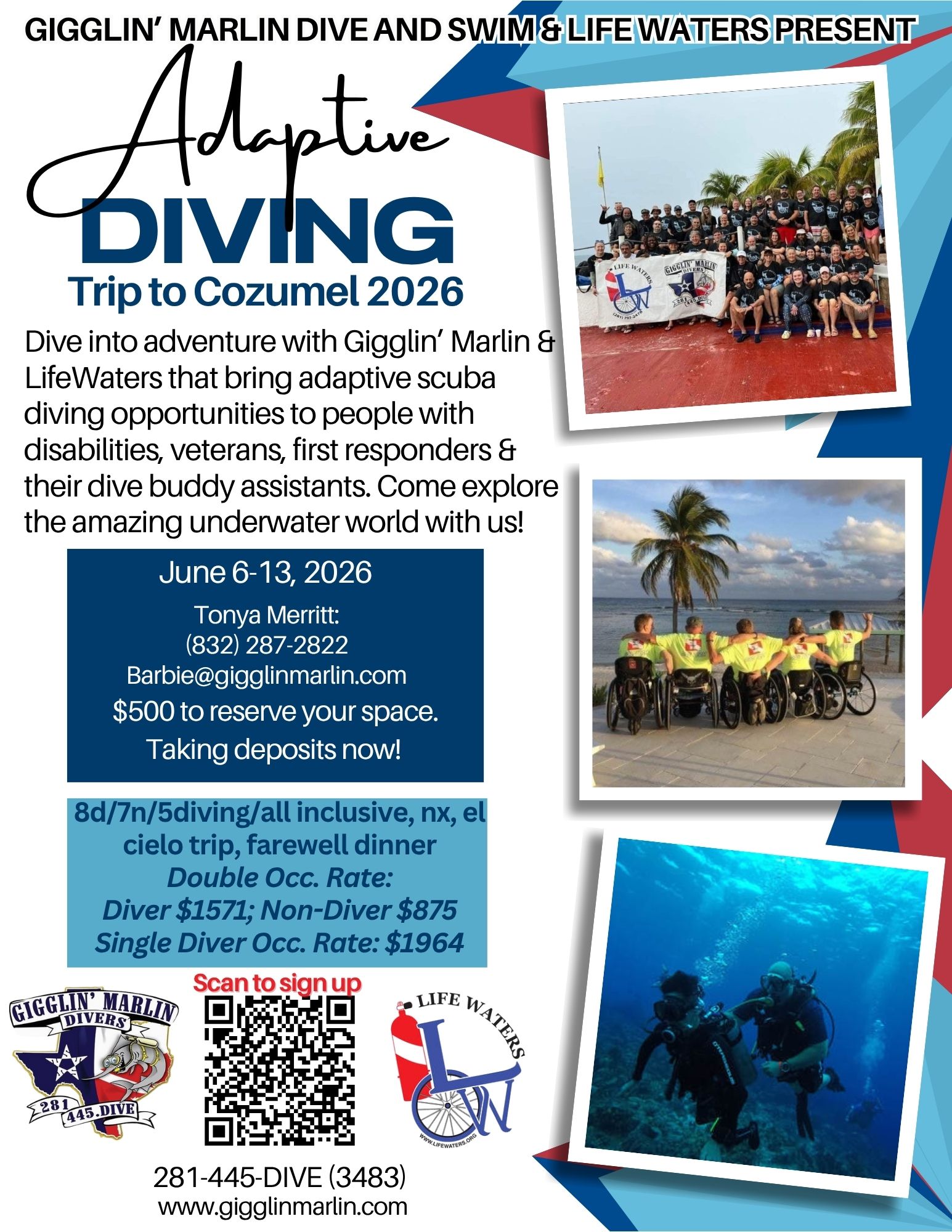 Gigglin’ Marlin Dive & Swim, Lifewaters and SDI Scubility Buddies are all partnering up for an Amazing Week of Adaptive Diving!! Meet up with old friends, meet new dive buddies and experience the ease of adaptable diving with the pros! Cozumel is the best diving spot in the world! We had an incredible time last year and we want you to join us this year!
